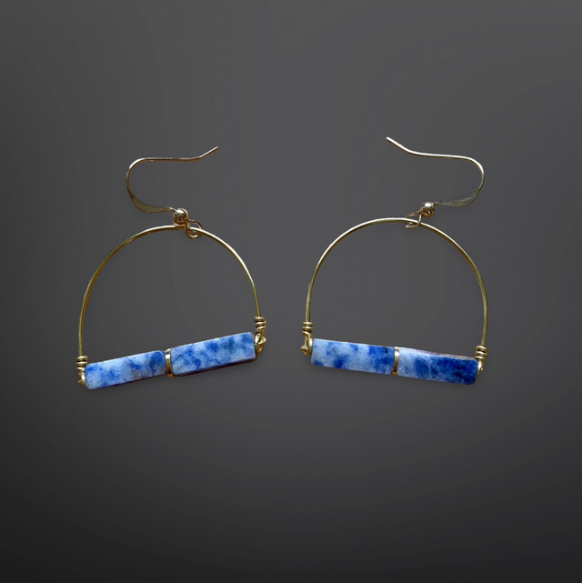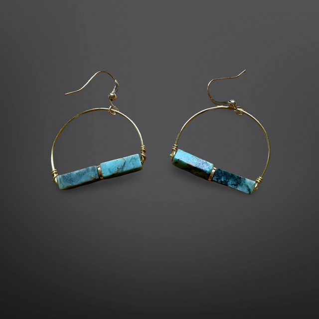 Boucles d’oreilles en fil de laiton avec deux perles en pierre fine et une rondelle heishi en gold filled. Clous d’oreilles en gold filled.